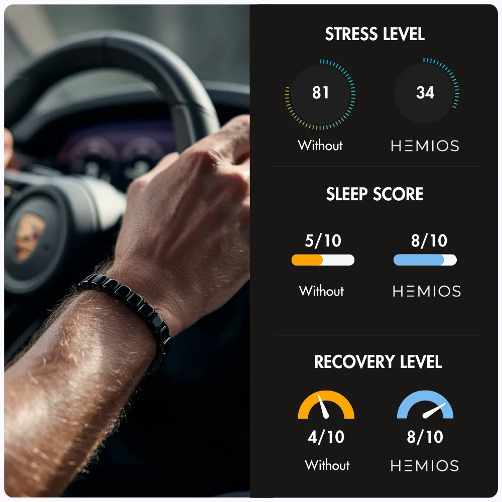 • "Unlock your natural edge — Hemios channels pure hematite's magnetic fieldcontinuously, so you maintain peak energy and masculine confidence through thelongest days and toughest challenges."